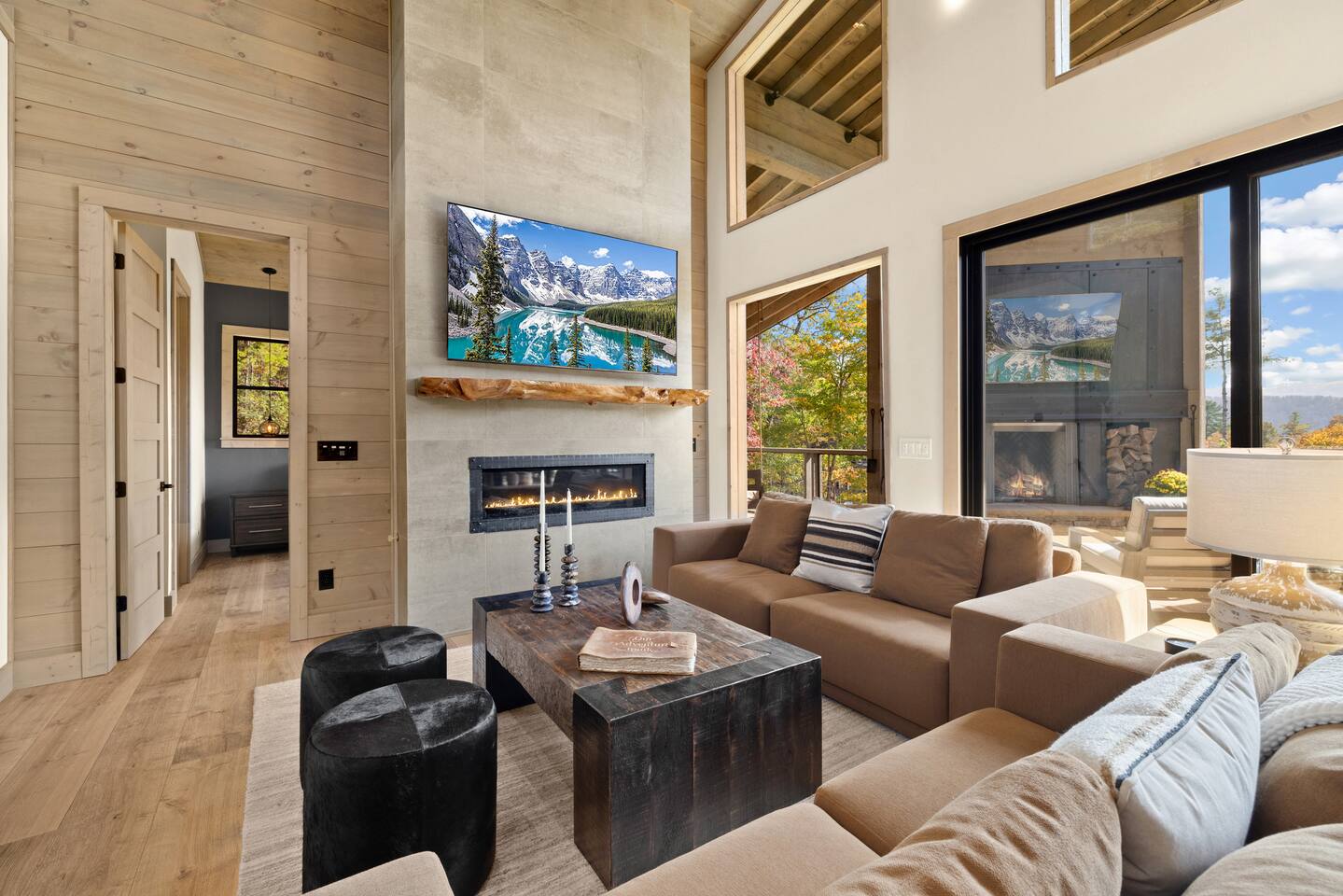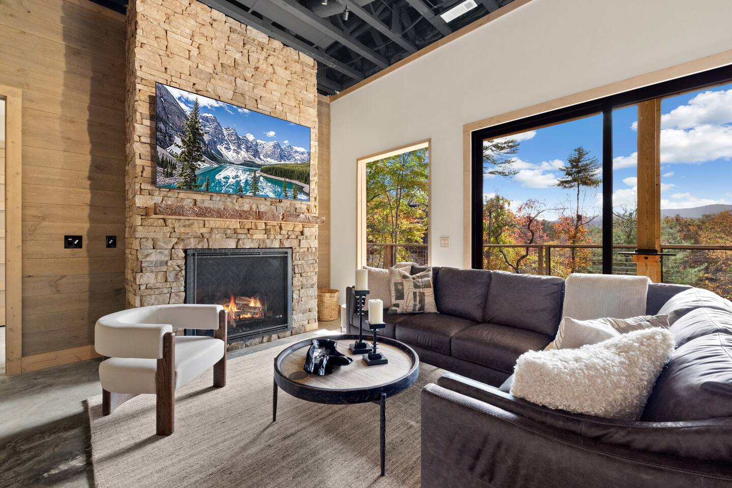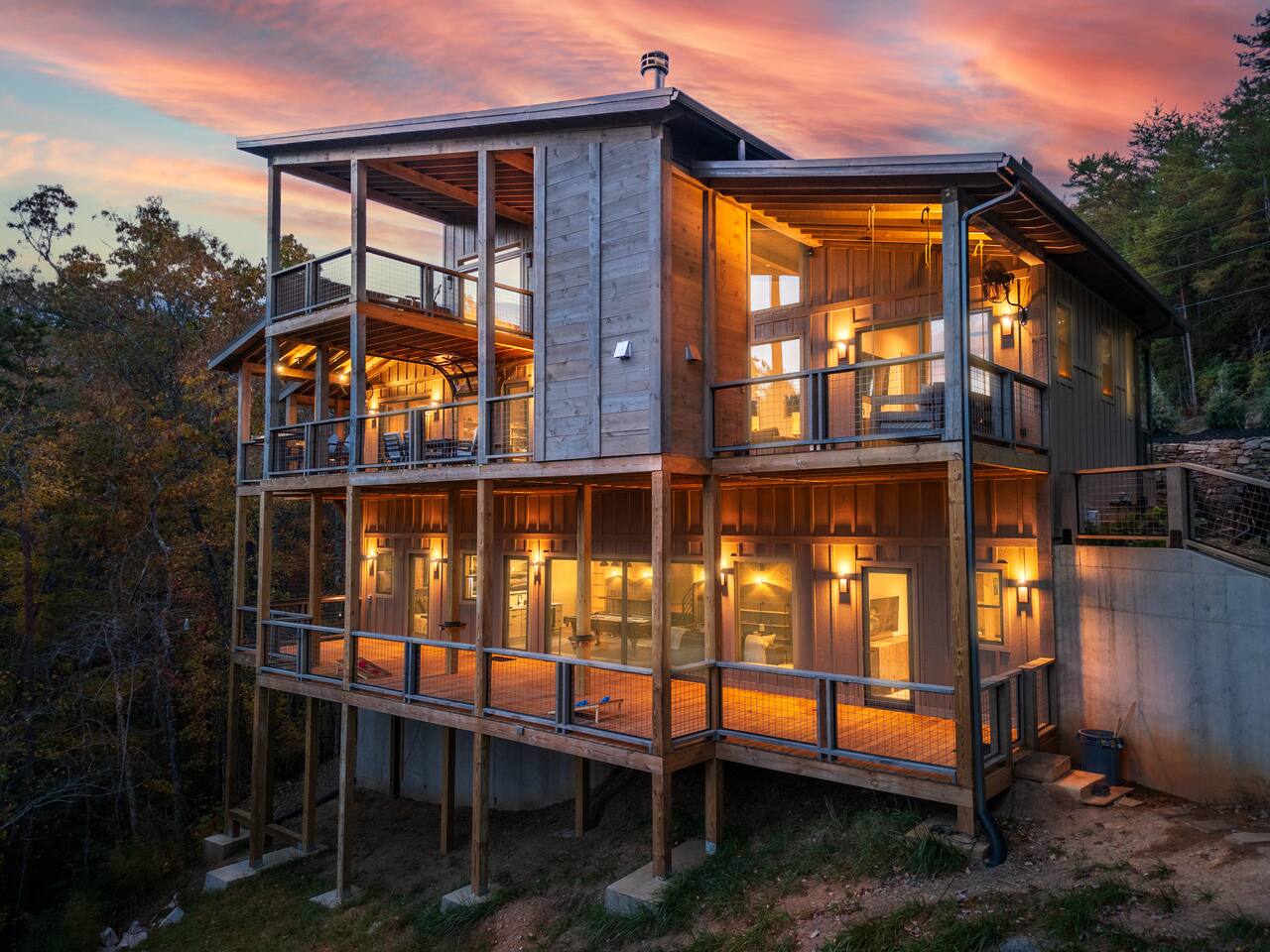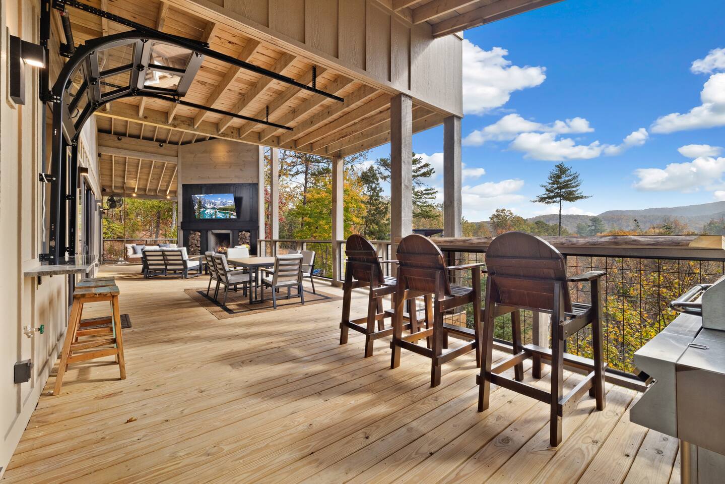 The Ridge is a brand new luxury mountain retreat just minutes to downtown Blue Ridge. Escape to this newly built luxury home just minutes to downtown Blue Ridge, GA. This custom home offers expansive mountain views the minute you walk in door. The soaring ceilings with floor to ceiling windows create the perfect indoor / outdoor living space for your enjoyment. We enjoy cooking and entertaining so the layout, with garage door window from the kitchen to the outdoor grilling station, is perfectly designed. No expense was spared on the finishes, furnishing, accessories and amenities so that our guests can feel at home. Our home is perfect for any kind of retreat; yoga, health/wellness, spiritual, family or business. We have equipped the home with the following amenities: Tesla Charging Station, Large Steam Shower, Deck Swing Bed for naps, Pool Table, Games, Gas Range, Outdoor Fire Pit with mountain views and so much more. Enjoy long or short stays to make your holiday one to remember.